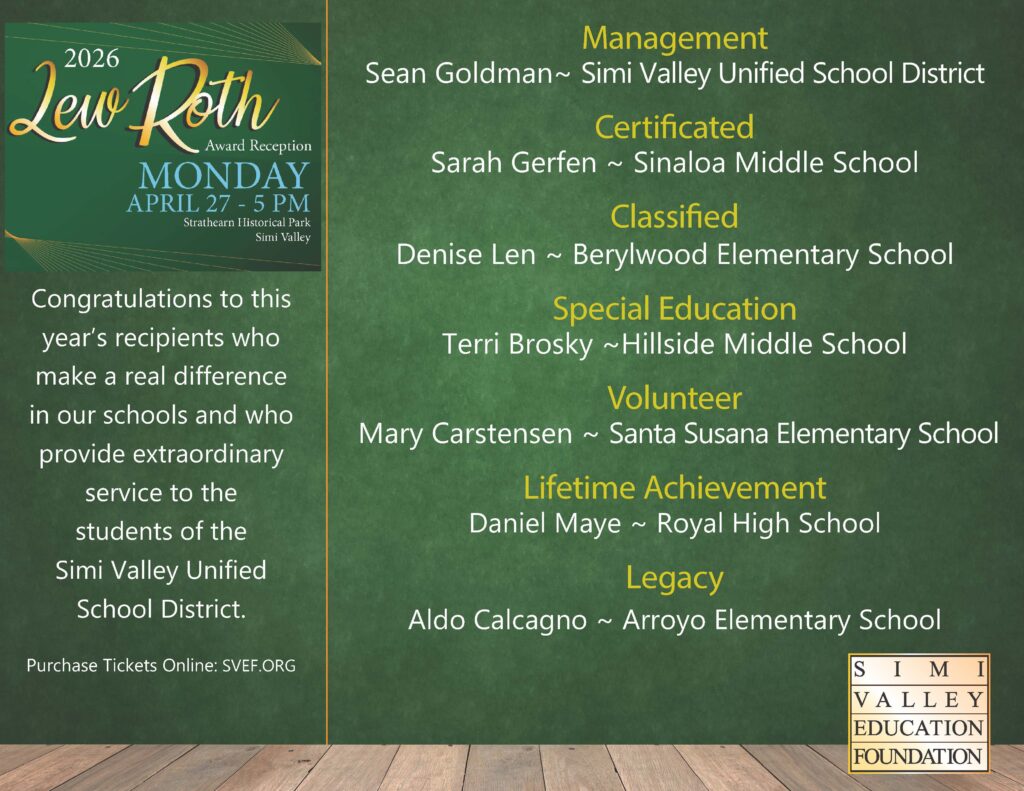 Each year, the Board of Directors of the Simi Valley Education Foundation honors the memory of Lew Roth, the founder of the Simi Valley Education Foundation. In his honor, the community, students, parents, certificated and classified staff, are asked to nominate worthy individuals for a Lew Roth Award. Recipients must work or volunteer within the Simi Valley Unified School District. Many dedicated individuals make a real difference in our schools and in the opportunities for children. It may be obvious dedication to the schools and students, or it may be quiet, but positive influence on students who need extra support or attention.
